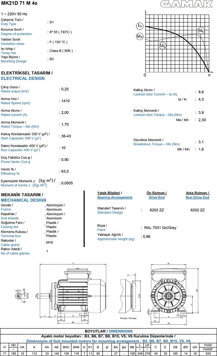 0.25 kw 1500 d/d Monofaze Daimi Kondansatörlü Elektrik Motoru